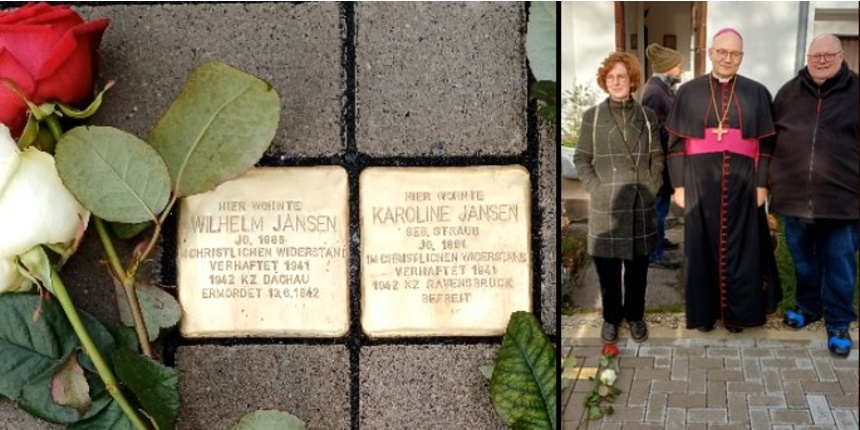 Hildesheim (kath.net) Am Montag verlegte die Stadt Aachen auch zwei Stolpersteine, die auf die Initiative eines engagierten Hildesheimers zurückgehen, der mit seiner Schwester Hildesheimer Rosen am neuen Gedenkort niederlegten. Der Aachener Bischof Dr. Dieser segnete die Steine in Anwesenheit der Niedersachsen und rund 50 weiterer Personen. Dem Kirchenoberhaupt der Diözese Aachen war es ein Herzensanliegen an der Verlegung der Erinnerungssteine teilzunehmen, da Wilhelm Jansen von der katholischen Kirche inzwischen als Blutzeuge anerkannt ist.